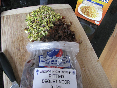 We visited a date farm while in Palm Springs last week, and as a souvenir brought home 3 pounds of pitted deglet noor dates. Now I do enjoy eating a few just as they are, but 3 lbs is a bit much. So yesterday I started cooking with them. First I made a date bread. It baked for just over an hour and came out of the oven a deep, dark brown. Not overdone, just crisp and sweet with brown sugar. For dinner I made couscous with dates and pistachios. Delicious! Sweet and crunchy, I'll make it again for sure. The bread recipe came from our America's Family Test Kitchen cookbook and the couscous from The Complete America's Test Kitchen TV Show cookbook 2001-2012 that I got for my birthday. I wish I could share a link to the recipes with you, but I'm just not a fan of cooking from my computer screen. I love turning the sticky, splattered pages. It's not so fun when spaghetti sauce soaks your computer! So I will stick with my real books and get back to cooking. There are still lots of dates to be baked!